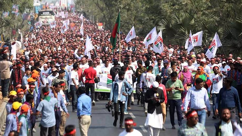 A protest march of thousands of people rocked the riverbanks in Lalmonirhat on Tuesday, demanding fair share of the Teesta River water and implementation of the Teesta Master Plan. As part of a 48-hour sit-in organised by the Teesta River Protection Movement, the march began at the Lalmonirhat railway bridge at noon.
